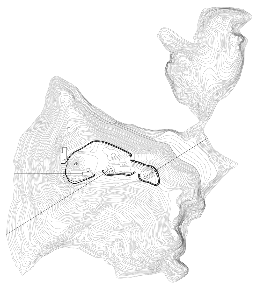 La Croix de Chamrousse à 2250m d'altitude est le point culminant du domaine skiable de la commune. Le télécabine et les trois télésièges qui y convergent et le bâtiment de télédiffusion de France hérissé d'antennes, ont fortement altéré le site naturel et remodelé lourdement sa topographie. Le restaurant, incision curviligne pratiquée dans la pente qui s'infléchit vers l'ouest pour échapper au passage des câbles, fait partie intégrante de ce sillon. Il en est la continuité et le prolongement. Le geste effleure, appuie et entaille puis effleure à nouveau. Il commence et se termine en fondu-enchaîné avec le terrain naturel. De part et d'autre de cette incision, le sol est renaturé en pierrier : en toiture à l'amont et en contre-escarpe à l’aval du restaurant avec l'exception de la terrasse du restaurant traité en glacis horizontal. |