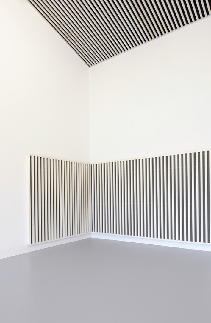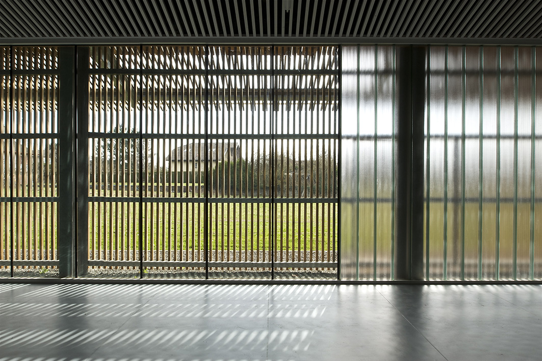 Une enveloppe de forme simple abritant une salle de spectacles, un grand toit unique à deux versants sur une assise rectangulaire et un volume intérieur homogène organisé selon une trame régulière qui libère le plan des contraintes. Un volume allongé, proche du sol, qui se coule dans l’étendue de la prairie et de ses légers vallonnements pour rentrer en osmose avec le paysage champêtre. Un bâtiment où le bois prédomine. Le bois constitué de tasseaux juxtaposés habille la toiture (sur-toiture à la manière des toitures porte-neige en montagne), l’ensemble des plafonds, constitue le bardage des façades et habille certaines parois intérieures. |